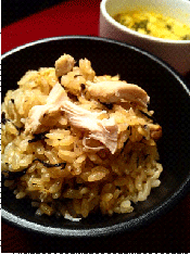 ④炊きあがったら、ささ身をほぐしながらかき混ぜ、出来上がり